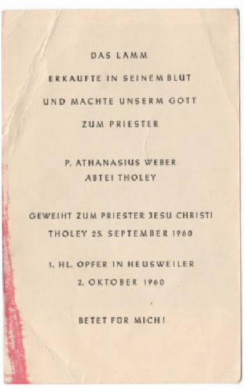 Erinnerungsbild ersichtlich 25.September 1960 zum Priester geweiht. Seine Heimatprimiz feierte er mit uns am 1.Oktober 1960 in