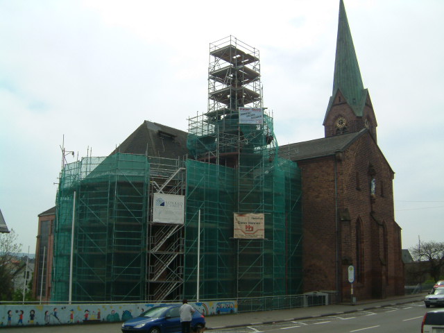 Pastor Welsch hat außer seiner Tätigkeit als Seelsorger noch einige bauliche Aufgaben zu erledigen Da waren zunächst die dringend notwendigen Sanierungen an Fassaden und Dächern Die alten Sandsteinfassaden wurden gereinigt ,z. T. ausgebessert und neu verfugt. Ganz beängstigend war der Zustand des kleinen Turmes, wie die folgenden Bilder zeigen werden.Der große Glockenturm wurde ebenfalls von Grund auf restauriert. Dabei wurde